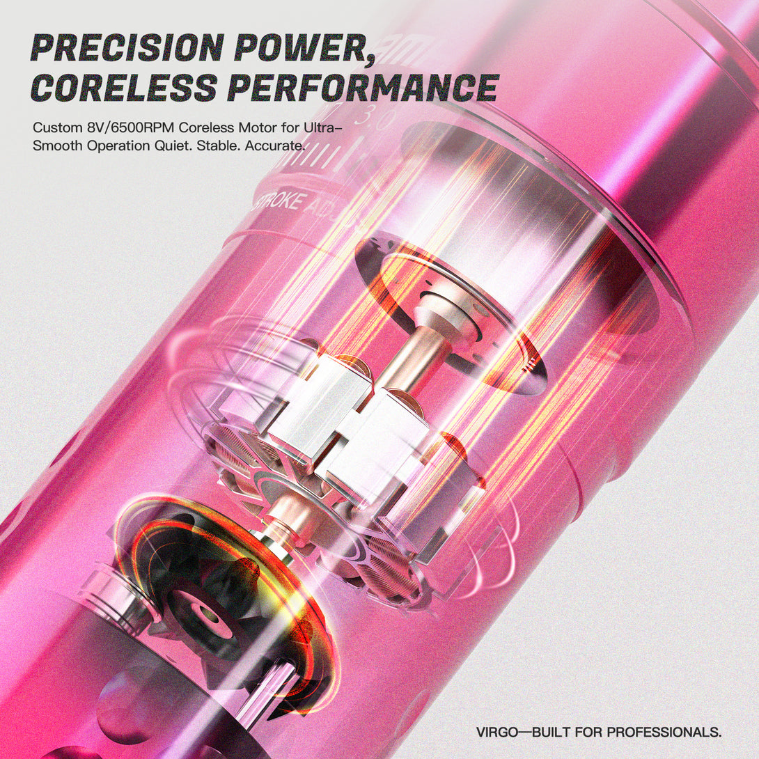 Virgo boasts a full-metal body with a glossy pink finish, blending fashion with professionalism, ensuring it stands out as a trendsetter in any tattoo studio.