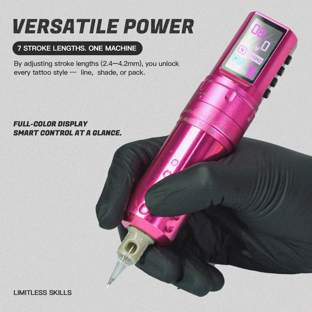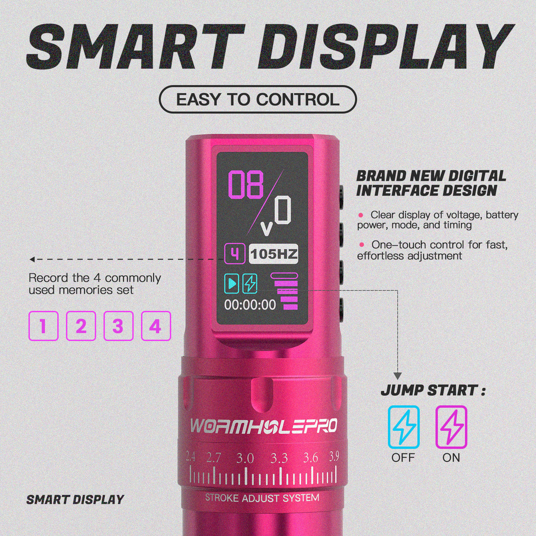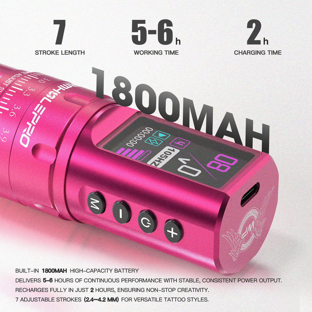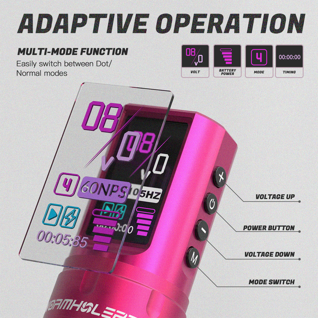 The Virgo tattoo pen is designed for professional tattoo artists who strive for excellence. Its full metallic pink body combines style and durability, while the HD display allows you to clearly monitor every operation. The optimized power management system and ergonomic design ensure comfort and stability during prolonged use. Choose wormholepro's Virgo to elevate your tattoo artistry to new heights.