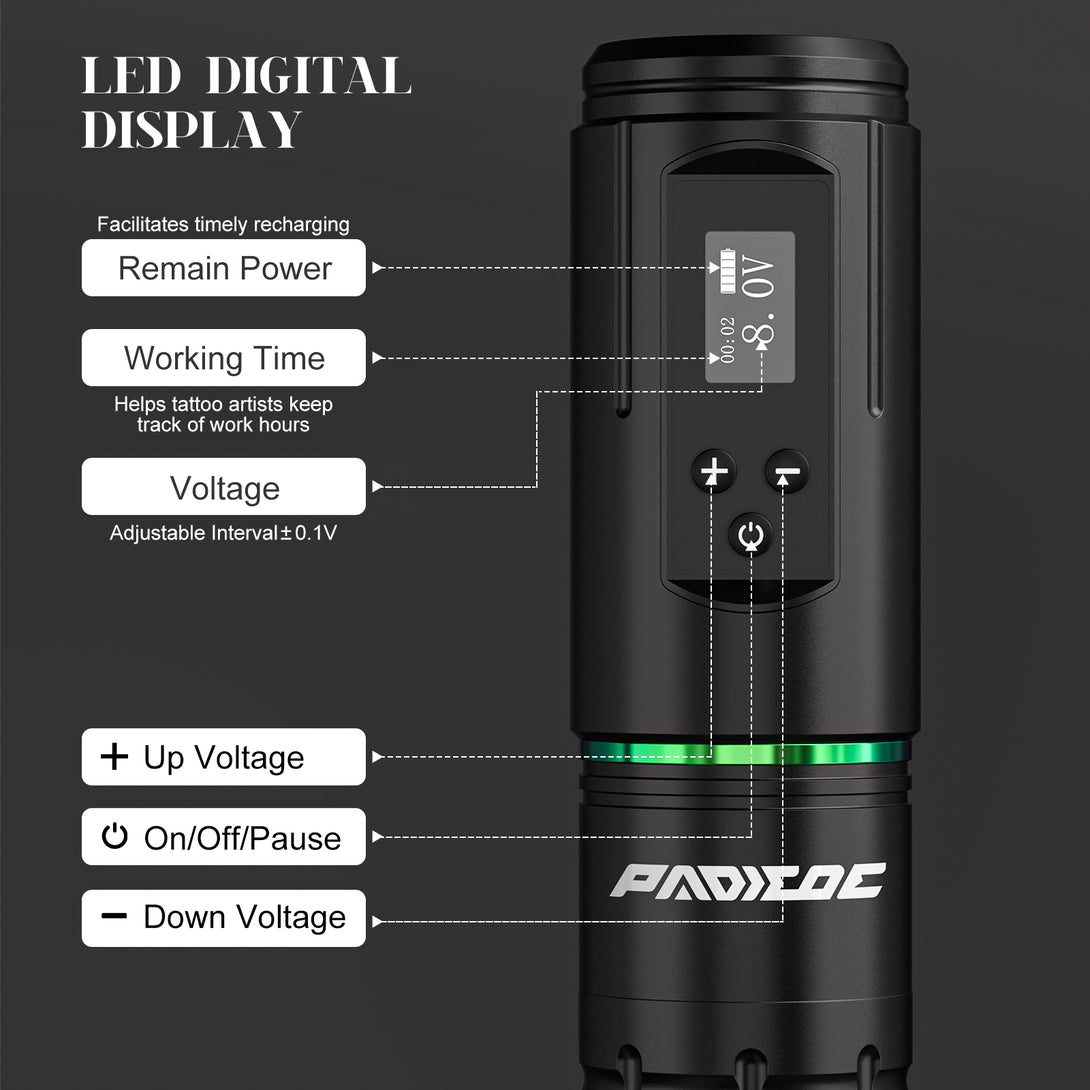 Digital LED Display: Real-time screen shows voltage, working time, and battery status, keeping your tattooing process fully under control.