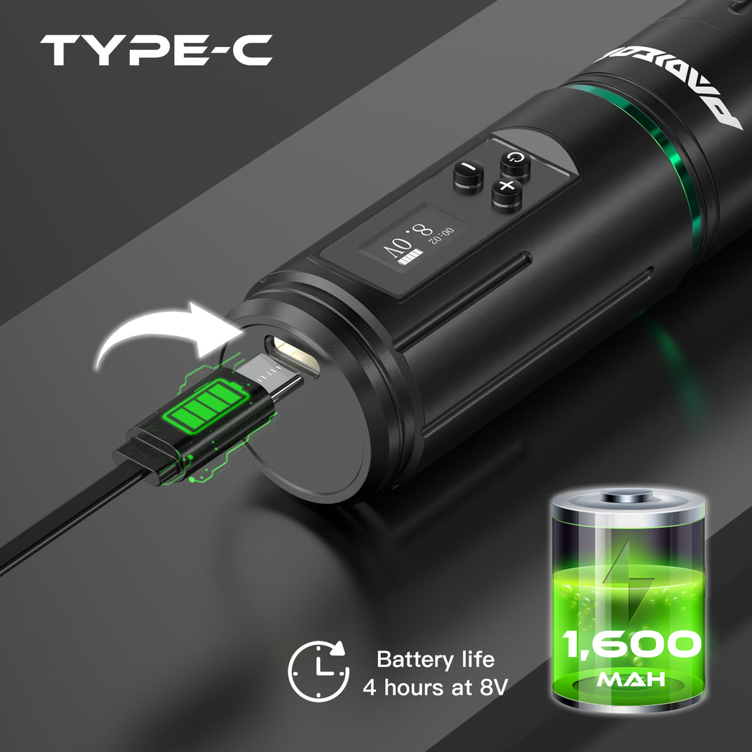 Powered by a 1600mAh rechargeable battery, this wireless tattoo machine delivers up to 4 hours of runtime at 8V and charges quickly with a Type-C cable. Its custom motor runs at 6900rpm, with an adjustable 3.5–4.5mm needle depth for versatile lining and shading.