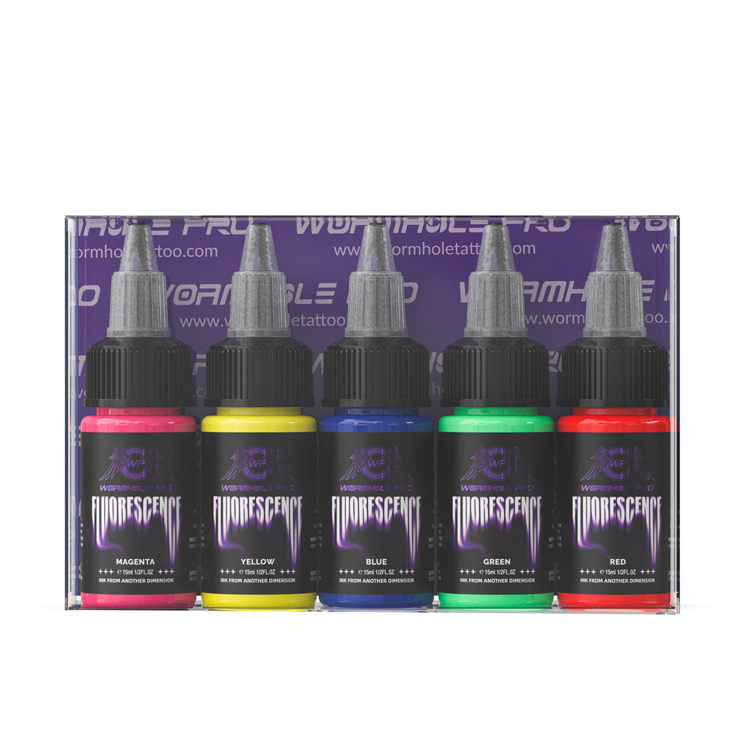 Step into the luminous world of tattoo artistry with the Wormhole Pro UV Ink 5-Color Set (15ml each) – INK FROM ANOTHER DIMENSION. This essential collection combines UV Yellow, UV Blue, UV Red, UV Green, and UV Magenta, delivering both primary and accent tones that glow brilliantly under UV light while retaining strong pigmentation in natural light. Perfect for artists seeking vibrancy, precision, and versatility in their designs.
